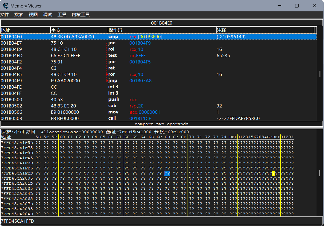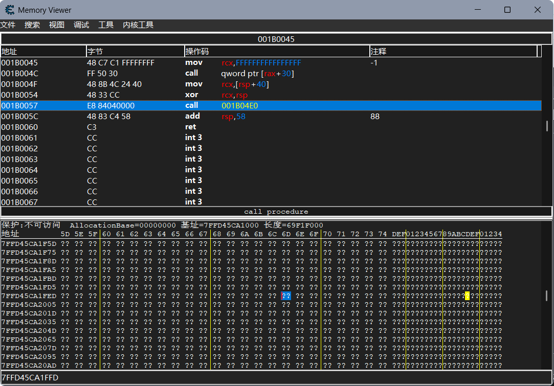 注入shellcode调用messagebox正常,调用NtAllocateVirtualMemory目标程序崩溃,发现调大SizeOfMyShell一千倍之后程序可以正常运行,查看注入的代码发现跳转到了shellcode以外的区域