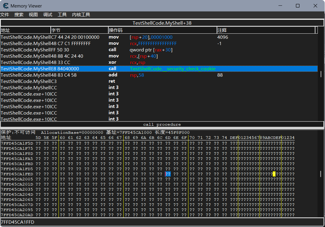我们查看负责注入程序的函数指令,发现call了一个TestShellCode.__security_check_cookie这个东西