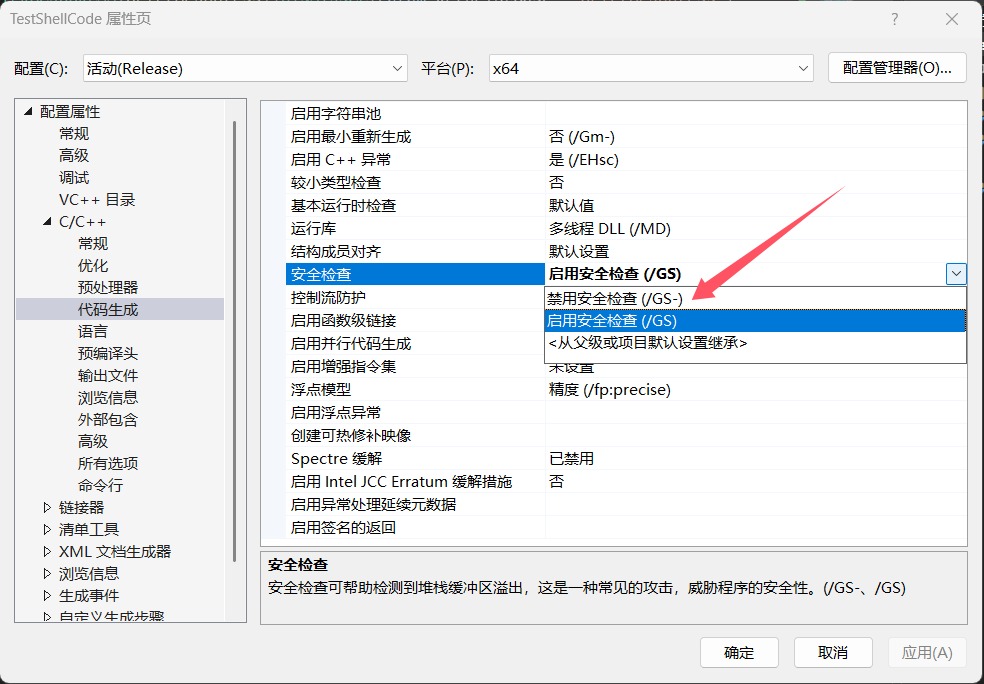 我们在项目属性 --> c/c++ --> 代码生成 --> 安全检查 中关闭gs安全检查